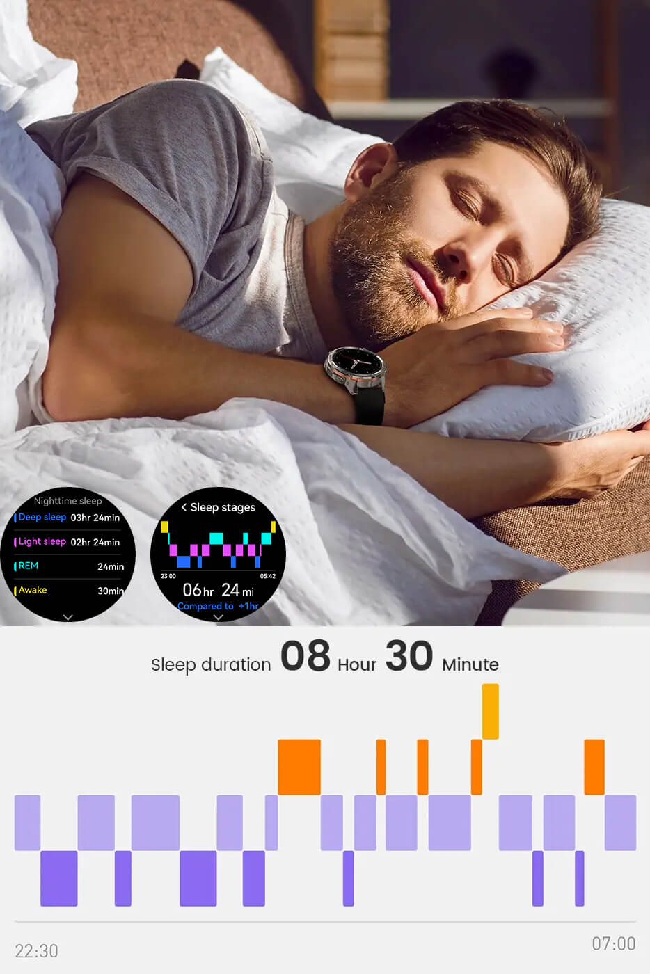 Sleep Tracking Sleep cycles (incl. REM), daily naps, sleep schedule